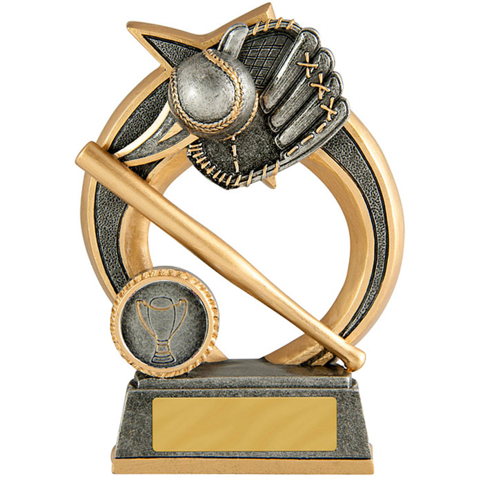 The Swoosh trophy features a bat, ball and glove on a unique star background. Finished in antique silver and gold colours. These baseball / softball trophies are available in 3 sizes with space for your free club logo centre and free engraving.