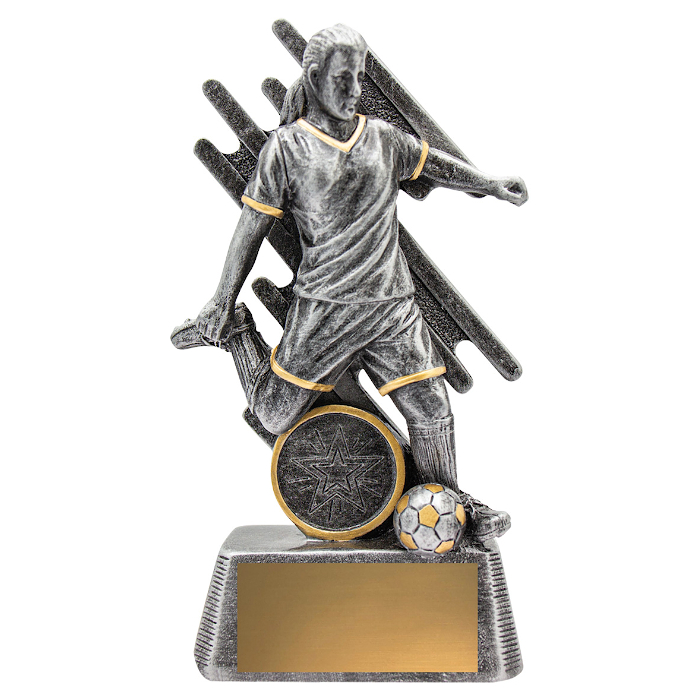 The Zoom Football Female trophy offers a brilliant new modern design showcasing a player in action against a stylised backdrop. These soccer trophies are available in 4 great sizes and include space for your free logo centre and free engraving.